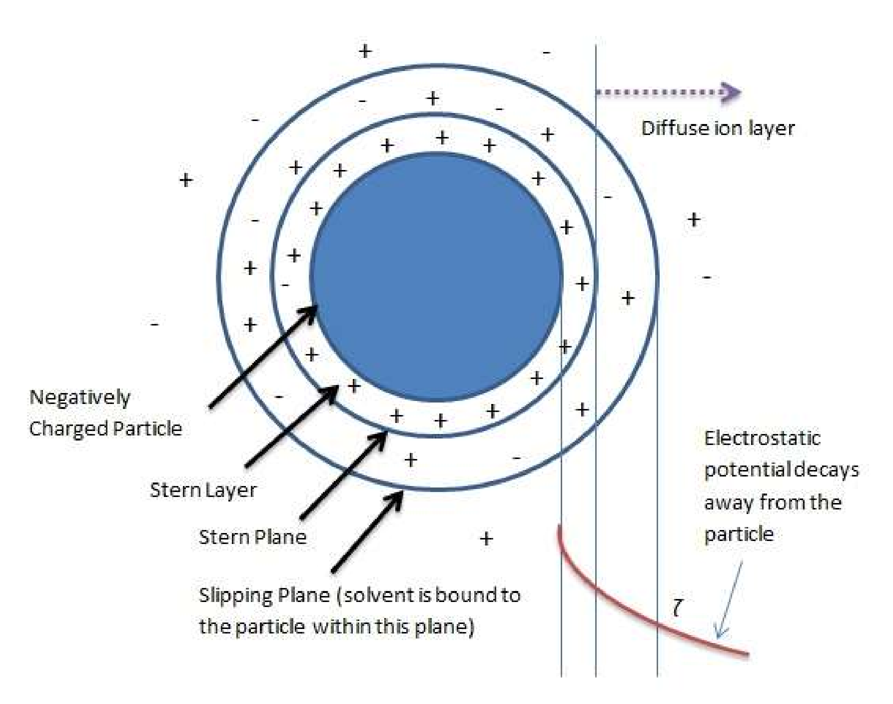 在水相介质中,Zeta电位分析仪通常是由于粒子表面的离子离解而产生的,在表面附近留下一个被反离子云包围的净电荷。各种类型的离子可以通过滑动面扩散进来和出去,滑动面允许Zeta电位根据液体中的离子组成而变化,例如pH值。离子也可以通过参与滑动面内的化学反应,从而影响Zeta电位。样品稀释可以显著地改变Zeta电位,因为离子可以吸附或者解析颗粒。因此,Zeta电位可以是正的或负的,也可以是零(等电点,IEP),这取决于液体(溶剂)的pH值或离子的类型和浓度。