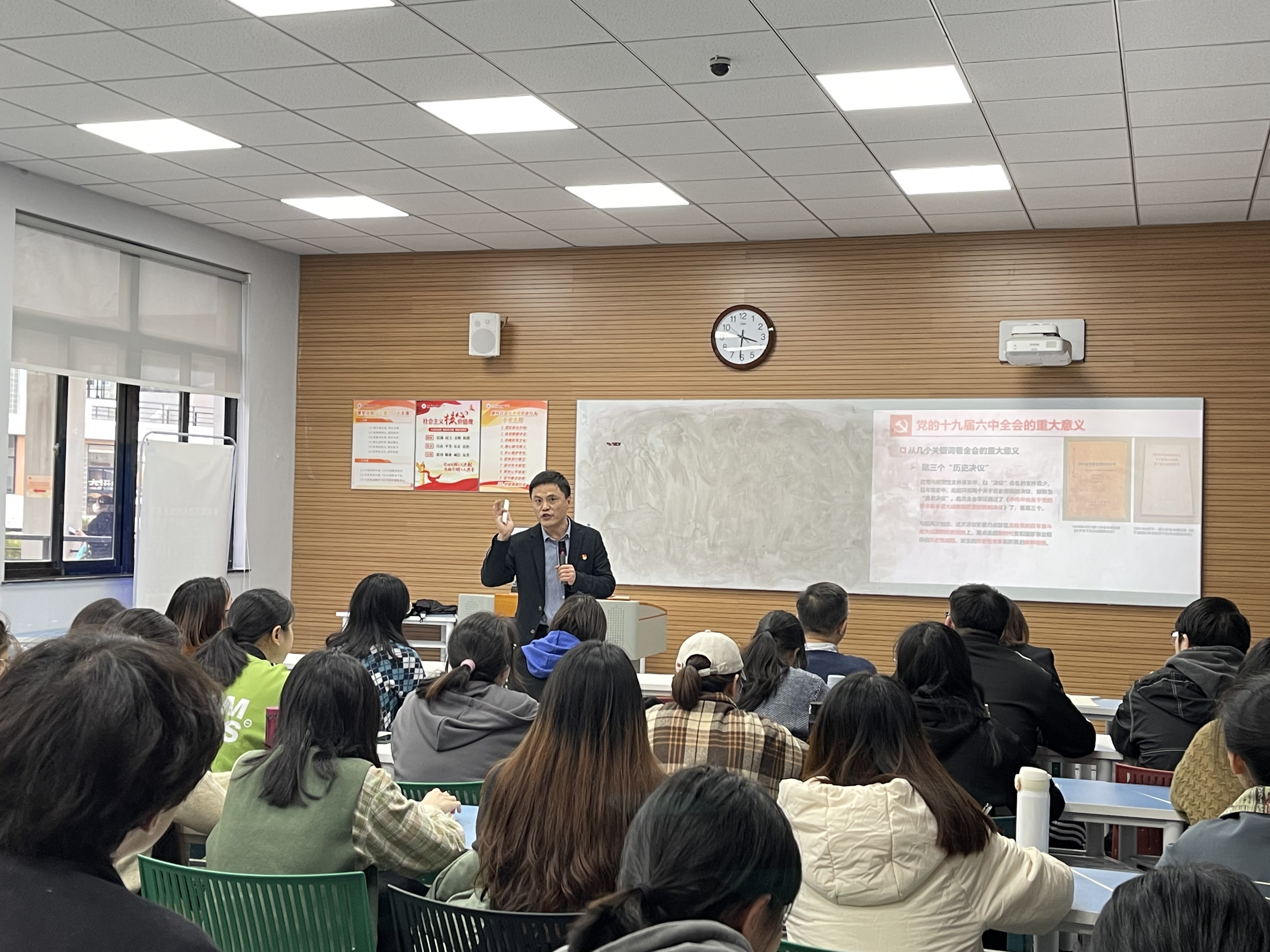楼文军老师带领全体党员回顾了党的十九大历次全会主要议题,重点剖析了十九届六中全会的重大意义。他指出,十九届六中全会是在我党走过百年光辉历程的重大时刻、站在“两个一百年”奋斗目标的历史交会点上召开的一次具有重大里程碑意义的重要会议,全会审议通过的《中共中央关于党的百年奋斗重大成就和历史经验的决议》深刻揭示了“过去我们为什能够成功、未来我们怎样才能继续成功”,是一篇马克思主义的纲领性文件,是新时代中国共产党人牢记初心使命、坚持和发展中国特色社会主义的政治宣言,是以史为鉴、开创未来、实现中华民族伟大复兴的行动指南。全党全军全国各族人民要更加紧密地团结在以习近平同志为核心的党中央周围,全面贯彻习近平新时代中国特色社会主义思想,大力弘扬伟大建党精神,为实现中华民族伟大复兴的中国梦而不懈奋斗。