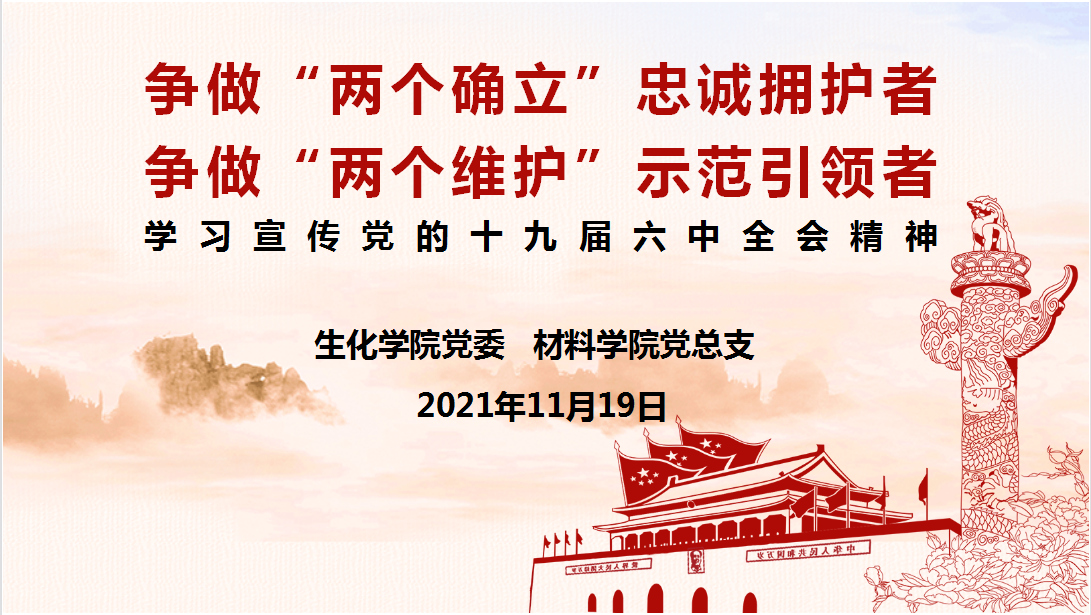 2021年11月19日下午,生化学院党委、材料学院党总支召开党的十九届六中全会精神专题学习会。生化学院党委副书记楼文军、材料学院党总支副书记俞峰,全体学生党支部书记,全体学生党员参加本次学习。楼文军以“争做‘两个确立’忠诚拥护者,争做‘两个维护’示范引领者”为题作专题党课。