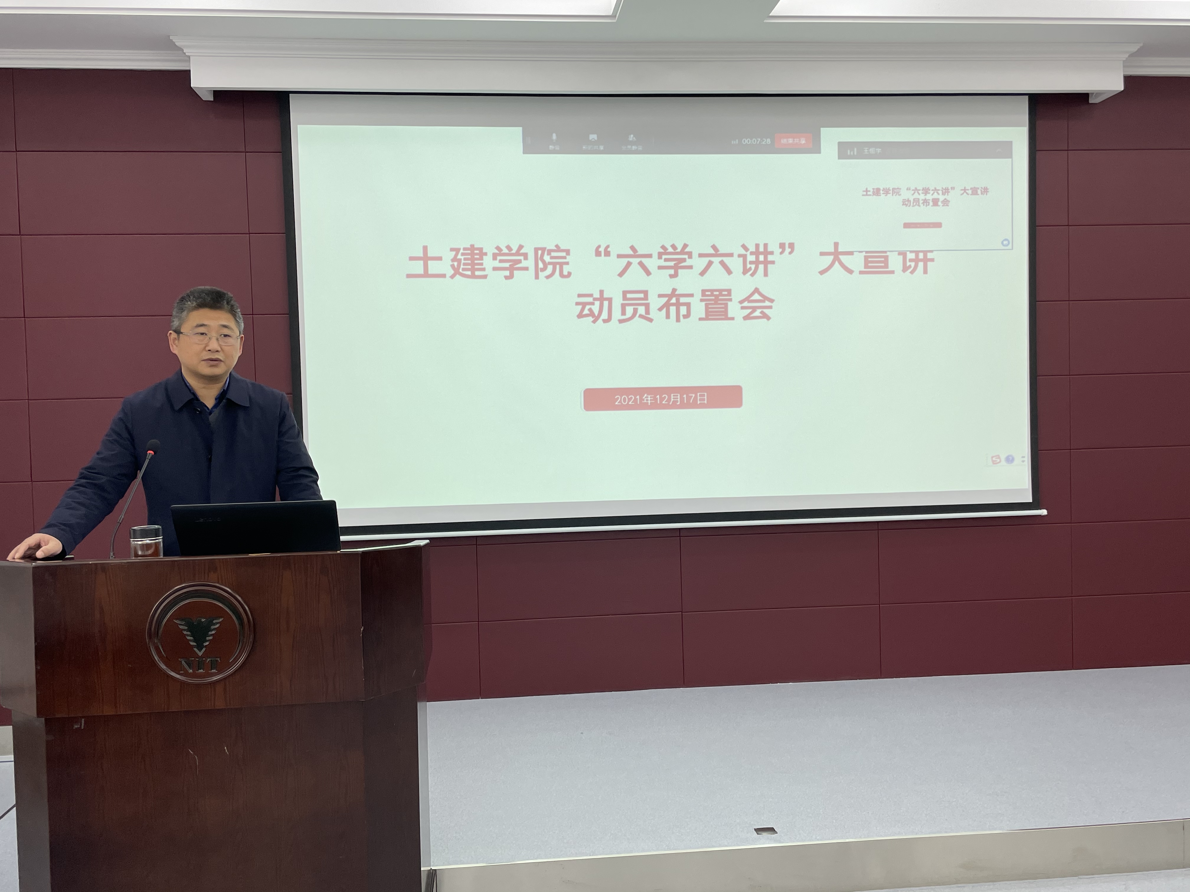 会议传达了学校关于深入学习宣传贯彻党的十九届六中全会精神的相关要求,介绍了学院“六学六讲”十九届六中全会精神学习方案,布置了书记讲党课、主题党日活动、课程思政“开课5分钟”、“砼盟”微宣讲、专题组织生活会、专题民主生活会、线上线下专题宣传等具体任务。