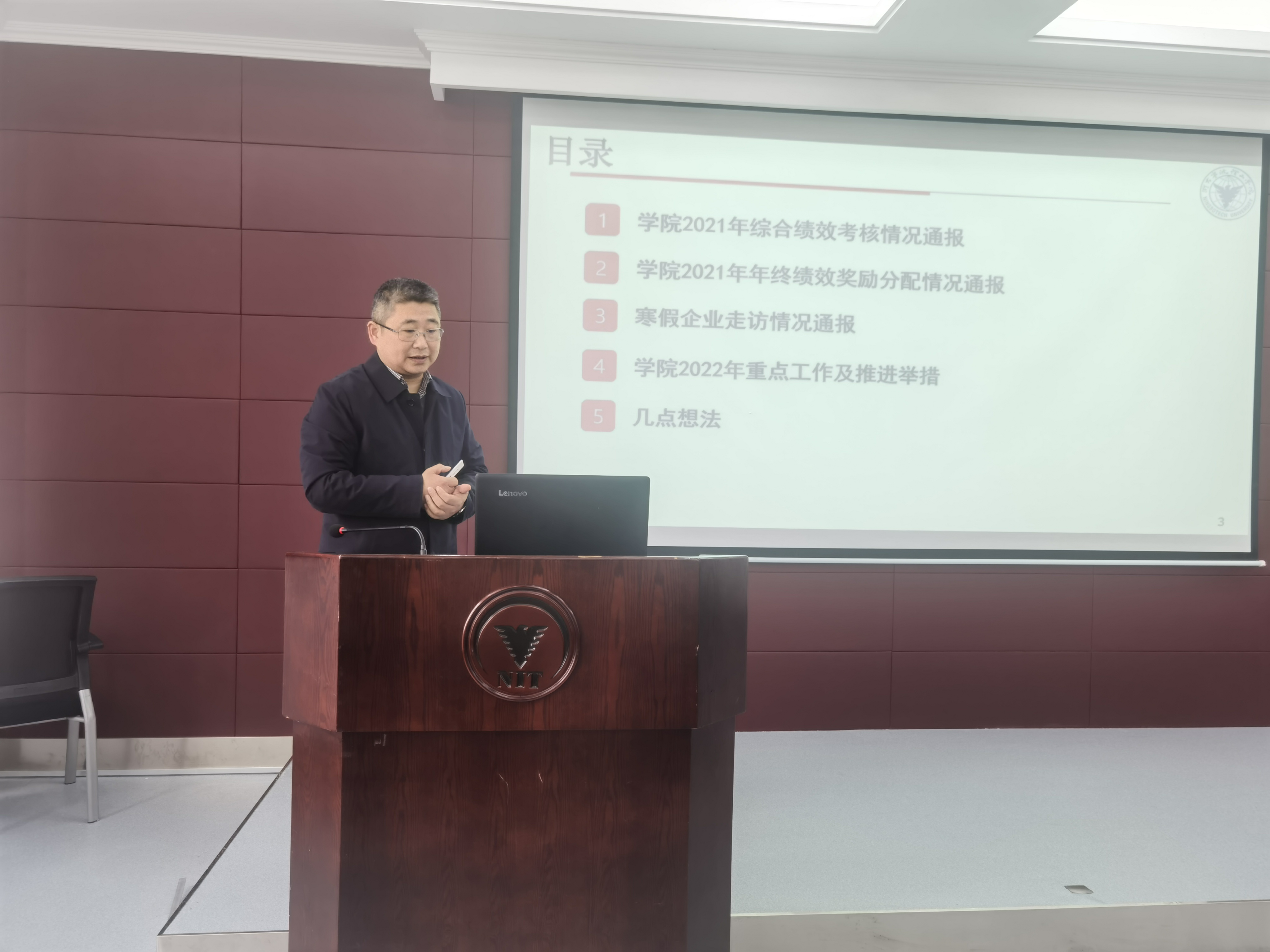 学院党委书记王银辉布置2022年学院重点工作任务。他通报了学院2021年综合绩效考核情况、年终绩效奖励分配情况、寒假企业走访情况、2022年重点工作及推进举措等。他强调,解放思想,牢牢盯住“硕士点申报、一流专业、专业认证、一流成果”四项重点工作,坚持重点工作重点支持,重点工作有序推进。他指出,师资队伍建设要适应硕士点建设需要、适应新专业发展需要,加快新教师成长速度。他对研究负责人提出希望,研究所要担负起新教师成长的主体责任,培养好、使用好新教师。他认为,青年教师也要有成长的主动性,要听得进忠言,耐得住抱怨,经得起批评,受得了辛苦。