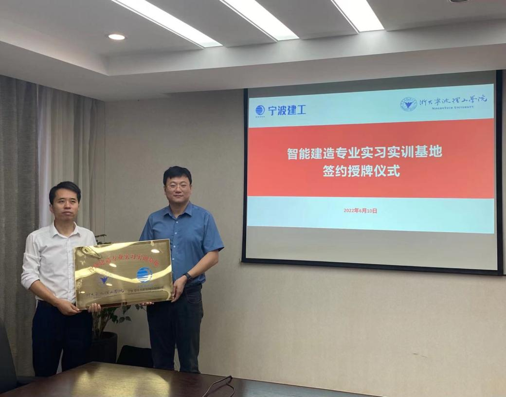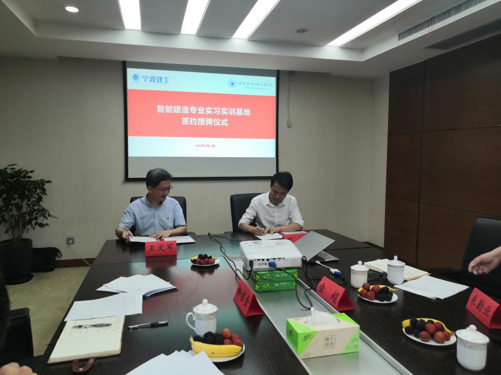 6月10日上午,bw必威西汉姆联官网与宁波建工工程集团有限公司举行了“智能建造专业实习实训基地”签约与授牌仪式。bw必威西汉姆联官网副院长王文军,副院长、智能建造与智慧管理研究所所长耿健、土木工程系副主任陈闯、学院教师柳根金,宁波建工集团工程技术研究院院长刘铁,工程技术研究院院长助理吴艳萍,人力资源部经理施彩虹等人出席此次仪式,并开展座谈交流。签约授牌仪式上,双方共同签署了“智能建造专业实习实训基地”协议,为“实训基地”授牌,并对共建合作期间的责任与义务达成了共识,同时围绕“四年一贯制校企联合实践教学班”工作实施方案及合作协议意见征求表展开进一步讨论。