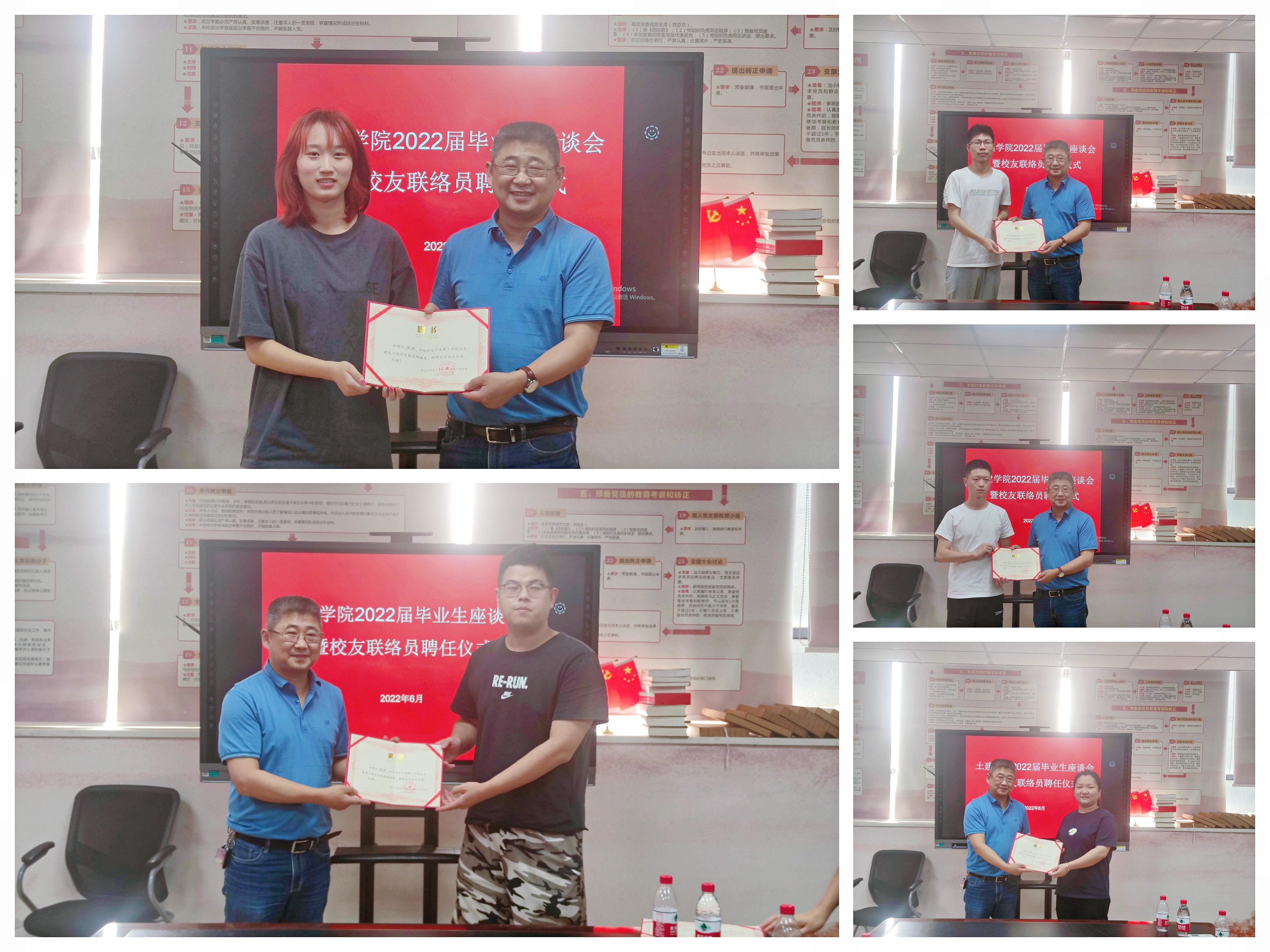 在校友联络员聘任仪式环节,学院党委书记王银辉为各班级联络员一一颁发聘任证书。他说,学院开展毕业班校友联络员聘任制度,是为了增强毕业生校友身份意识,加强校友与学院之间的长久联系,他希望所有联络员尽职尽责做好联络工作,保持热情,珍惜这份职业和荣誉,发挥好情感纽带功能,积极为校友及母校服务。