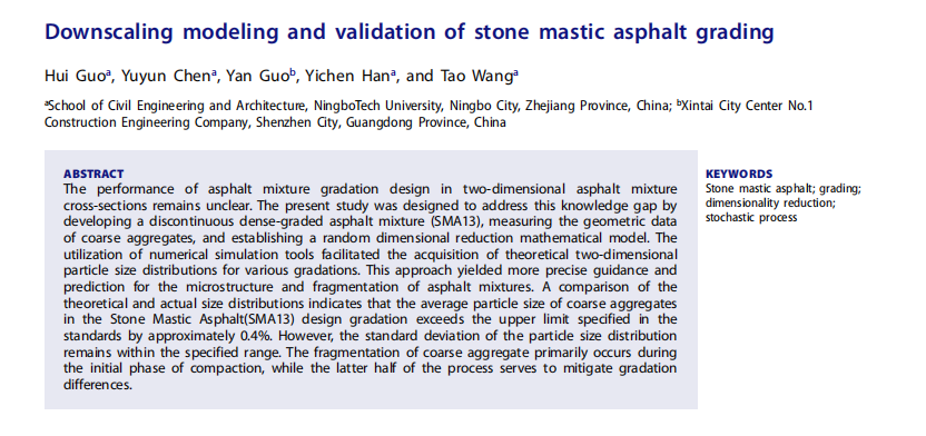 近日,我院2021届本科生陈俞妘同学的研究论文“Downscaling Modeling and Validation of Stone Mastic Asphalt Grading”被国际颗粒科学杂志Particulate Science and Technology发表,JCR2区。Particulate Science and Technology期刊的主编单位是美国波士顿大学,该期刊的研究领域涵盖颗粒科学和技术,包括颗粒的制备、表征、处理、应用等方面的研究,行业认可度较高。论文得到了其主持的国家大学生创新创业计划的(SMA级配路面的压实机理研究)支持(指导老师郭辉),为我院大学生创新创业计划首次发表SCI论文。陈俞妘同学目前已被广西大学录取为2025届硕士研究生,王韬老师为本文的通讯作者。