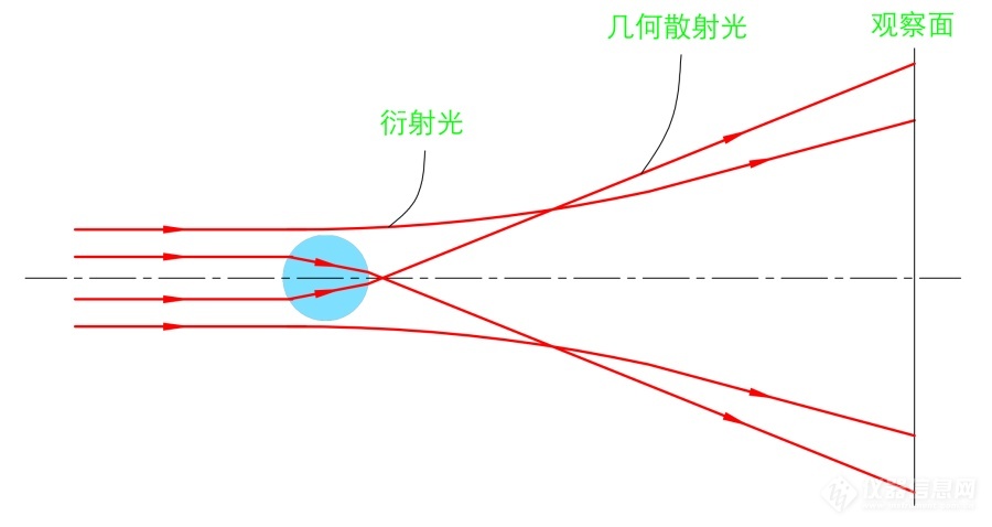请看图1。在颗粒远大于光波长的情况下,颗粒对光的散射,可以分成两个部分:衍射和几何散射。从无限远(远场)的位置观察,衍射光的偏离角度只跟颗粒在观察面上的投影的大小有关,颗粒越小,衍射角越大,这部分信息可以用来分析颗粒的大小。几何散射光是指光线投射到颗粒表面以后,一部分发生反射,另一部分经过折射进入颗粒内部,又在另一个界面上发生折射(到介质)和反射的现象。散射光场是这两部分光的叠加。图1中只画出了衍射光和一次折射光。从远场看,几何散射光的相对强度分布与颗粒大小无关,只与颗粒的折射率与吸收系数有关。另外,当颗粒很大时,衍射光的分布范围远远小于几何散射光的分布范围,但是由于两种散射光的总能量相同,所以从小角度看,衍射光的强度要远远大于几何散射光的强度。这也是在小角度范围内观察大颗粒的散射光时,可以只考虑衍射光的原因。