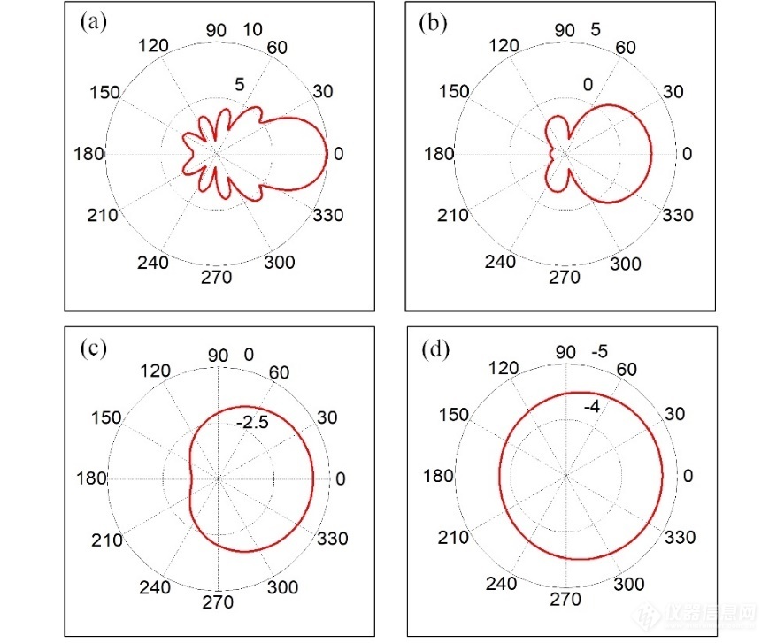 图中的坐标系是对数极坐标,方位角就是散射角,辐射线的长度是散射光强度的对数。(a)(d)分别表示1µm、0.5µm、0.25µm和0.12 µm的颗粒的散射光强分布。
