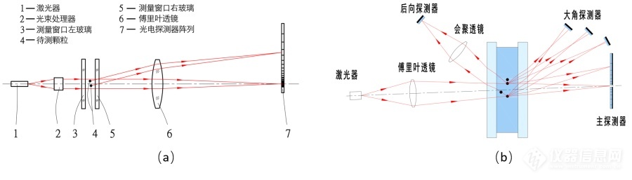 采用图6(b)所示的散射光接收系统的仪器是国外品牌,在中国占有很可观的市场份额。然而这种结构由于丢失了0.3微米以细颗粒的光能分布主峰的信息(见图5(b)),从而注定了难以很好地测量0.3微米以细的实际样品(有别于标样,因此通常都用“通用”模式)。
