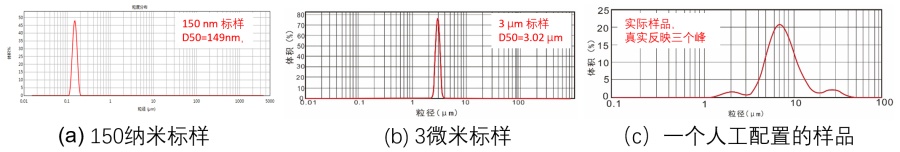 上述问题如果没有合理的解答,那么从基本的科学逻辑出发,我们就可以得出这样的结论:一种仪器有多种分析模式是仪器性能不完善的表现。国产的bw必威西汉姆联官网的仪器就完全没有这样的问题。它只有一个统一的反演模式,不论测什么样品,都用同样的算法。图8是上述3个样品用国产bw必威西汉姆联官网测量的结果:150纳米和3微米标样的D50值和分布形态完全符合预期,实际样品的3个峰也能得到正确的体现。