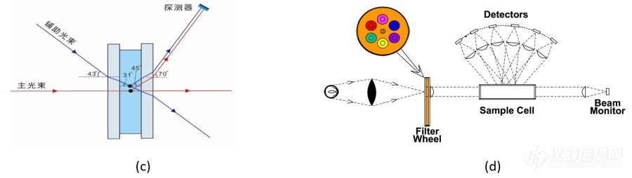 图6(c)是一种是多光束方案,是为突破全反射的限制而专门设计的。它用一束光作为主光束,正入射到测量池,用另外一束或两束光作为辅助光束,斜入射到测量池。如果设置后向探测器,则只需一束辅助光。。通常,为了尽量扩大仪器的测量范围,主光束用红色激光,而辅助光束用蓝色LED光源。假设辅助光的对测量池的入射角为45°,那么在该辅助光的配合下,测量盲区可以减小32°。如果只有主光束时散射角测量上限为41°,那么现在的测量上限可达73°。但是它的缺点是,主光束照明情况下的散射光测量和辅助光照明下的测量(如果两束辅助光,也要分别测量)必须分开进行,两次测量的数据拼接,不是一件容易做好的事情。如果辅助光和主光用不同的波长,还需要同时获取两种波长所对应的折射率。有时要得到一种波长的折射率都有困难,两种更难了。