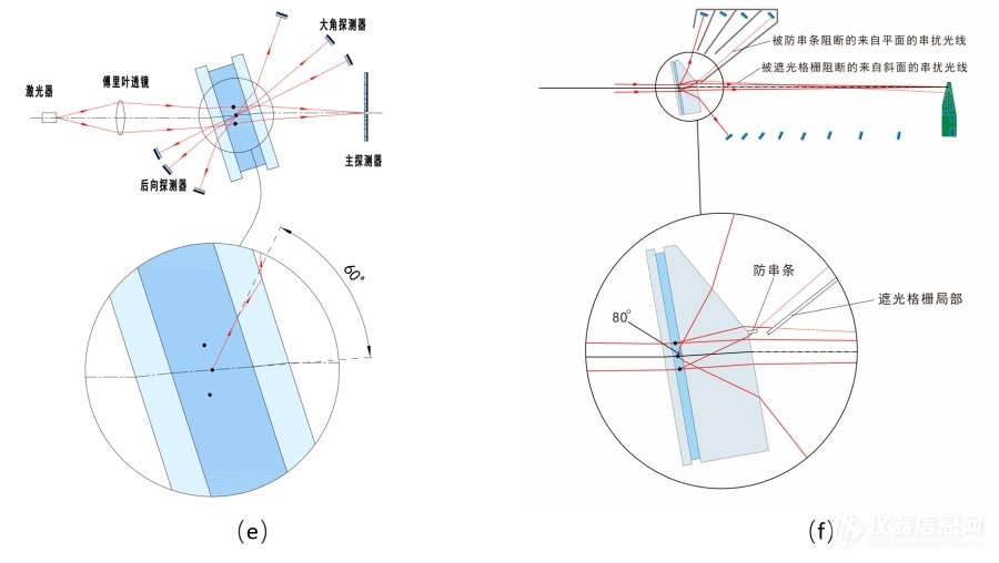图6(f)是bw必威西汉姆联官网在用的“斜置梯形窗口”光学系统。它只需一束照明光。测量池整体倾斜10°,不影响入射光的聚焦,测量池右侧的玻璃做成梯形,让接近或大于全反射临界角的散射光从梯形的斜面出射。这种方案能让前向最大散射角达到80°,使系统能够接收所有亚微米颗粒的散射光能分布的主峰信息,见图5(c)。这是目前前向散射接收角最大的光学系统,而且还只用了一束照明光,没有数据拼接问题。是一种世界领先的方案。