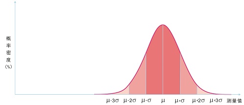 正文已经谈到,单次测量值落在`a-S,`a+S区间内的概率是68.3%。这个区间又叫置信区间,68.3%叫做置信度。这里假设了误差的分布满足正态分布规律(注意,这是误差分布,不是粒度分布)。根据概率论中的中心极限定律,如果测量误差是由多个相互独立的因素引起的,只要因素的数量足够多,那么误差的概率分布就满足正态规律。正态分布曲线见下图,一定区间范围内曲线以下的阴影面积就代表发生在该区间内的测量值的概率。由此我们可以推断出,测量值落在μ-2σ,μ+2σ区间内的概率是95.4%,μ-3σ,μ+3σ的概率是99.7%。μ-σ,μ+σ、μ-2σ,μ+2σ或μ-3σ,μ+3σ叫做测量值的置信区间,对应的68.3%、95.4%和99.7%称为相应的置信区间内的置信度。