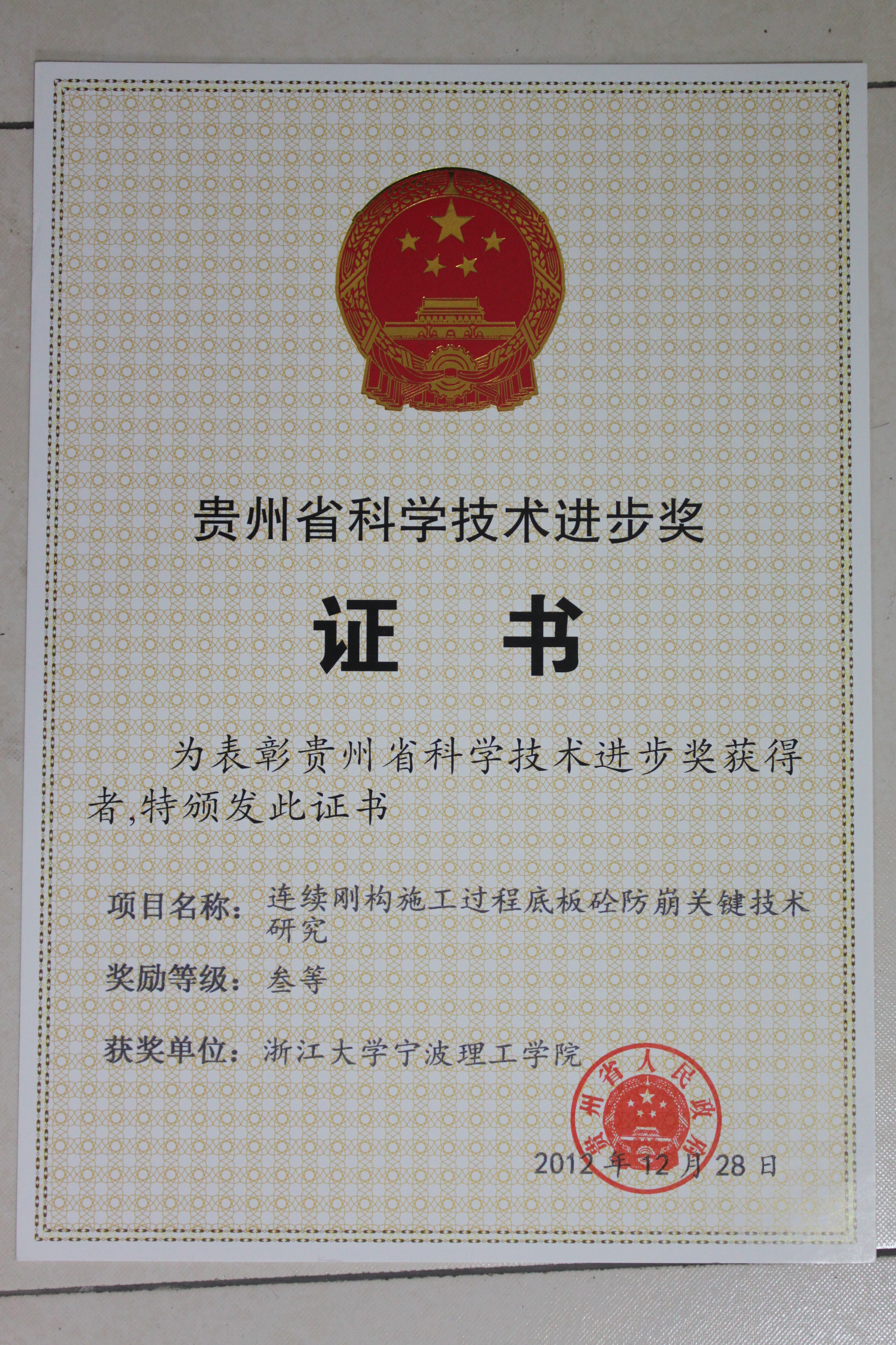 日前,从贵州省科技厅传过来喜讯,由贵州省交通规划勘察设计研究院股份有限公司与浙江大学宁波理工学院合作开展的“连续刚构施工过程底板砼防崩关键技术研究”项目获得2012年贵州省科学技术进步奖三等奖,我校bw必威西汉姆联官网王银辉副教授作为项目主要参与和完成者,排名第二。