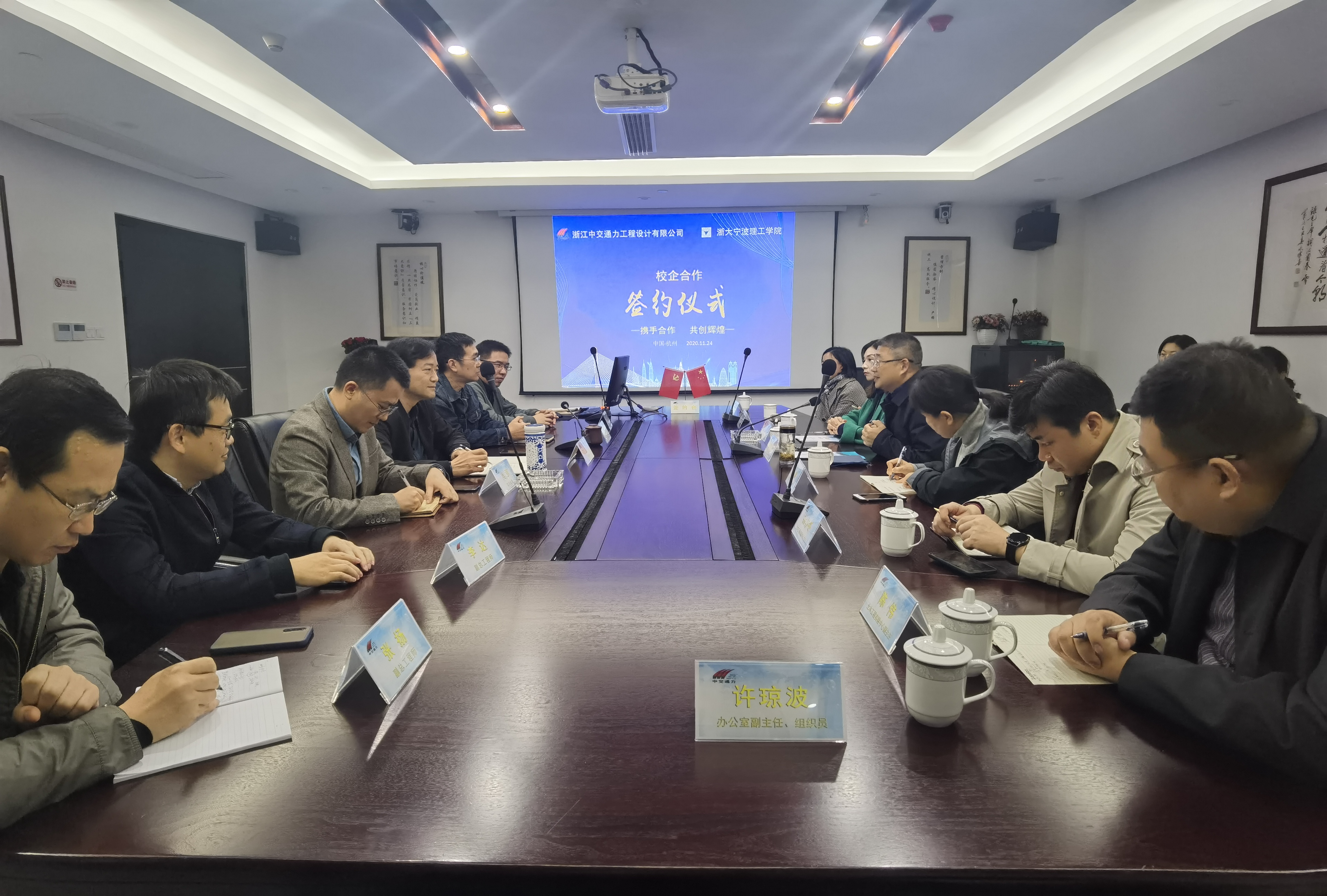 2020年11月24日,浙大宁波理工学院bw必威西汉姆联官网党政、教务、学工人员在党委书记王银辉、党委副书记韩晶晶的带领下到访浙江中交通力工程设计有限公司开展交流学习活动。双方在会议室进行座谈会。