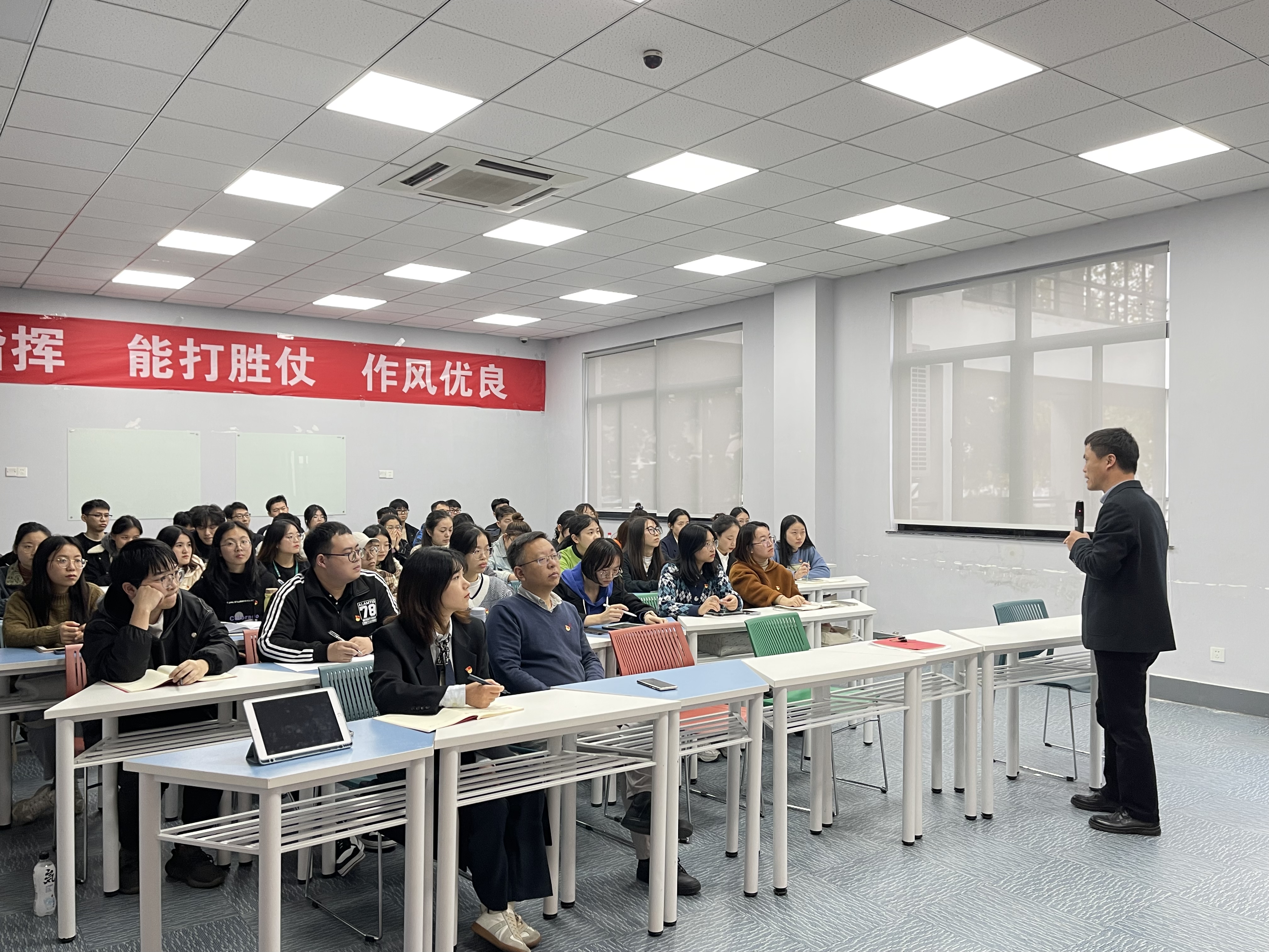 2021年11月19日下午,生化学院党委、材料学院党总支召开党的十九届六中全会精神专题学习会。生化学院党委副书记楼文军、材料学院党总支副书记俞峰,全体学生党支部书记,全体学生党员参加本次学习。楼文军以“争做‘两个确立’忠诚拥护者,争做‘两个维护’示范引领者”为题作专题党课。