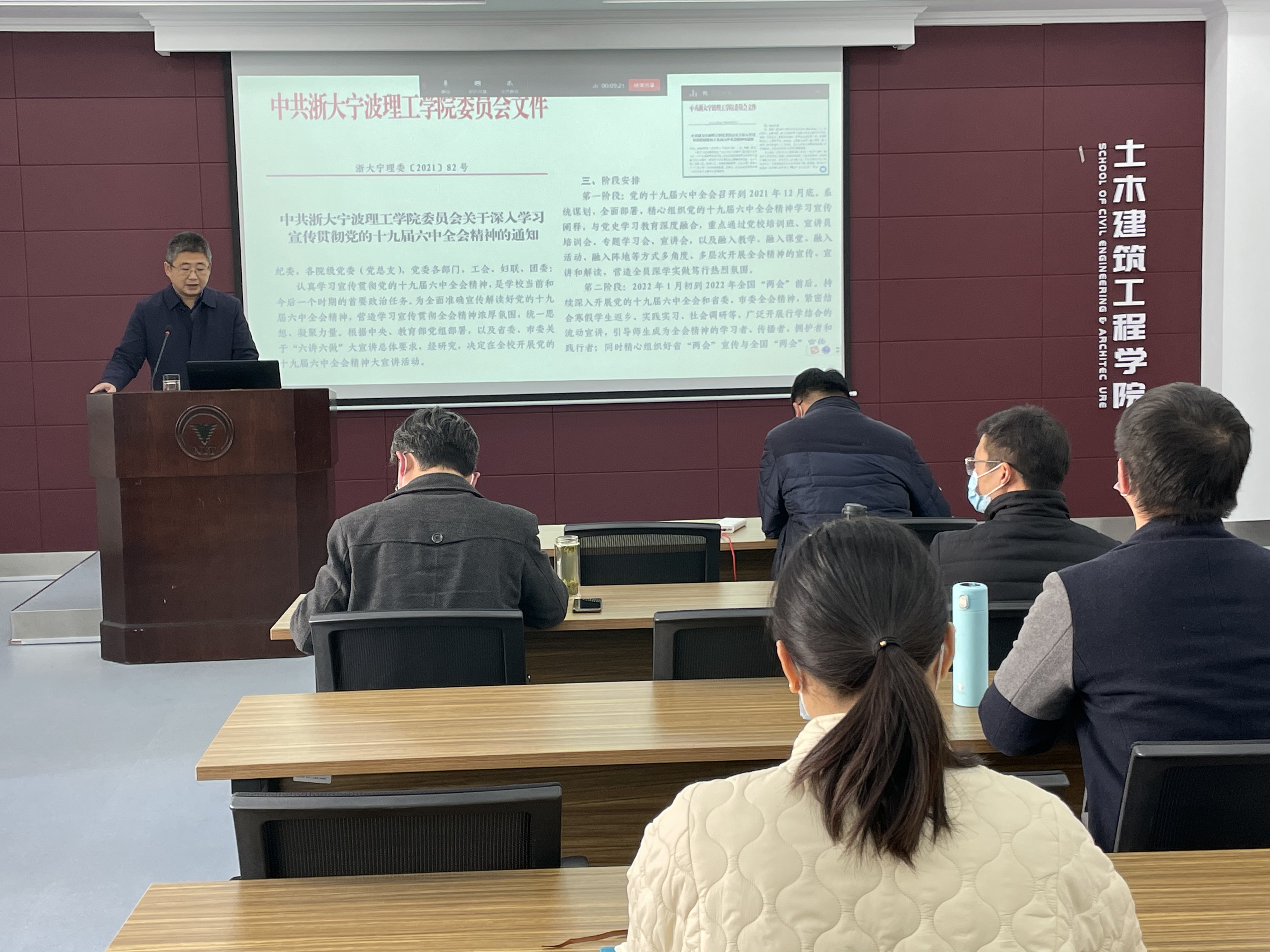 会议传达了学校关于深入学习宣传贯彻党的十九届六中全会精神的相关要求,介绍了学院“六学六讲”十九届六中全会精神学习方案,布置了书记讲党课、主题党日活动、课程思政“开课5分钟”、“砼盟”微宣讲、专题组织生活会、专题民主生活会、线上线下专题宣传等具体任务。
