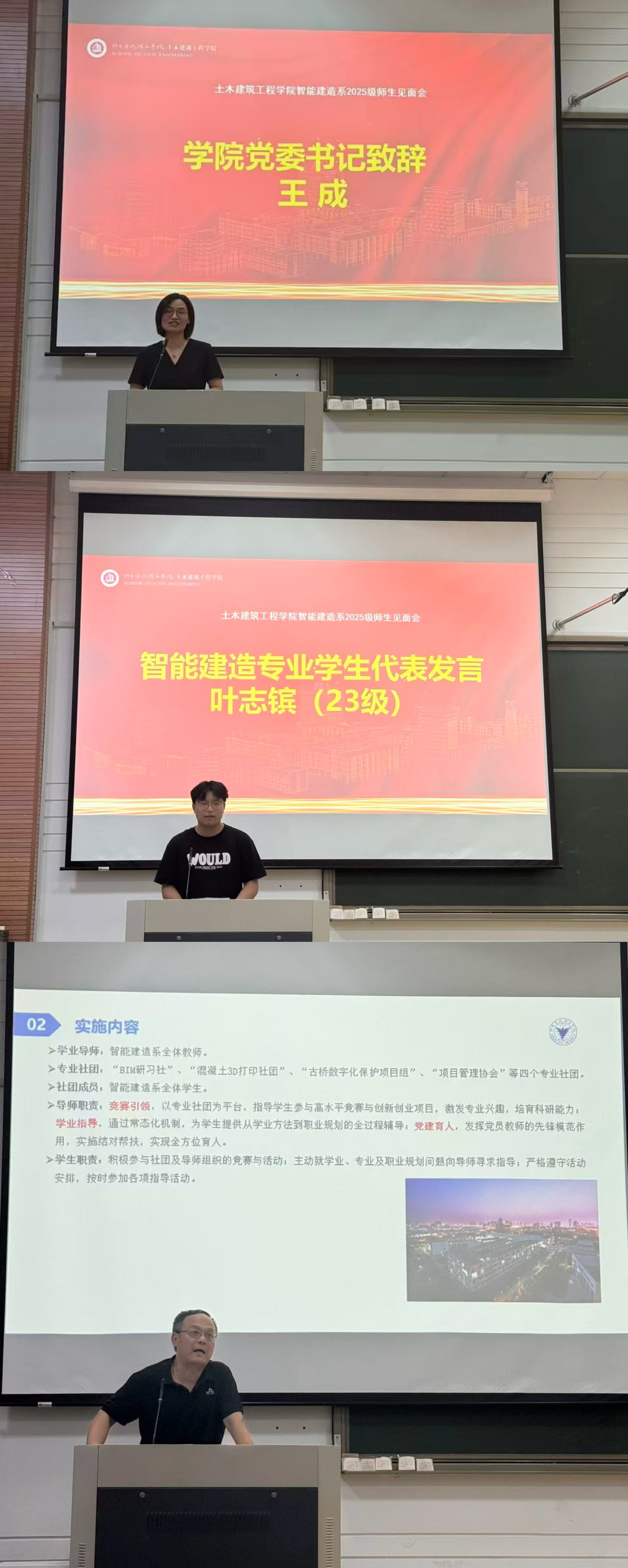 会议伊始,学院党委书记王成围绕 “什么是大学”、“大学之路怎么走”致辞,以温情且坚定的话语激励新生迈出大学生活第一步;随后,系主任耿健致辞,深入介绍了系部的建设历史、发展愿景与总体定位,为新生勾勒了清晰的专业发展蓝图。紧接着,25级班导师代表吴萍、23级智能建造专业学生代表叶志镔、24级工程管理专业学生代表付泓菱先后上台发言,他们结合自身经验,真挚分享未来求学路上的机遇与挑战,为新生提供实用参考。此外,相关负责人还详细介绍了新生始业教育安排及 “专业社团+学业导师” 的实施方案。