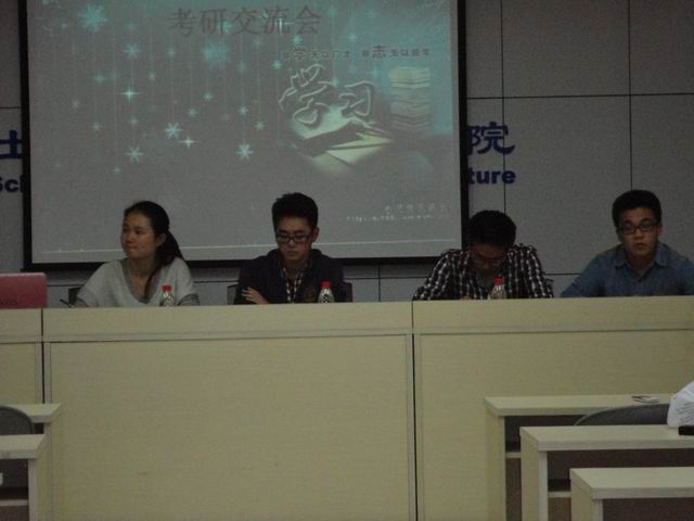 2012届考研成功的三名同学也极具代表性。胡仁伟以364分顺利考取上海大学,在校期间年年获得优秀学生奖学金,参与教师科研项目并共同获得多项专利,第二作者书写的论文被EI收录,他从如何准备考研等方面详细分享了自己的心得;张凯以341分被重庆交通大学录取,他则是从浪子回头的角度分析了考研的可行性,大一大二的成绩并不突出,有点浑浑噩噩,到了大三以后奋发图强,并最终考上了研究生;林颀栋今年考了351分,第一志愿报了北京交通大学没有录取,辗转调剂到重庆交通大学,他从如何选择合适的报考学校入手,以及一旦需要调剂如何第一时间抓住有用信息等方面分享了自己的经历。一句句发自肺腑的话语使得本来犹豫不定的同学下定了考研的决心。在交流完各自的经验之后,还就关心的话题进行了现场问题。