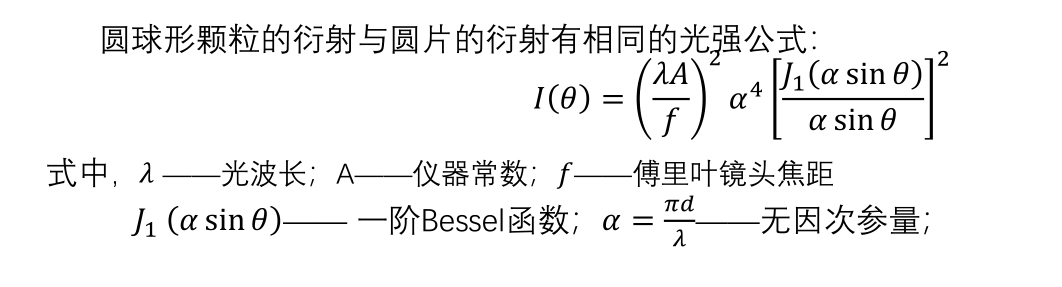对衍射现象,当观察点到衍射物体的距离为有限值时,称为“菲涅尔衍射”,当距离为无限远时,称为“夫朗和费(Fraunhofer)衍射”。在激光粒度仪中,探测器放置在傅里叶镜头的焦平面上,等效于在无限远处观察,故为“夫朗和费衍射”。在激光粒度仪中,采用衍射理论时,又称采用“夫朗和费理论”。