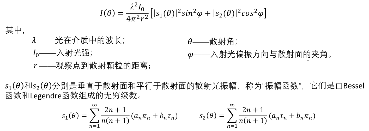 根据严格的麦克斯韦电磁方程以及边界条件,当一束平行光照射到均匀、各向同性的球形颗粒上时,远离颗粒的散射光的强度为